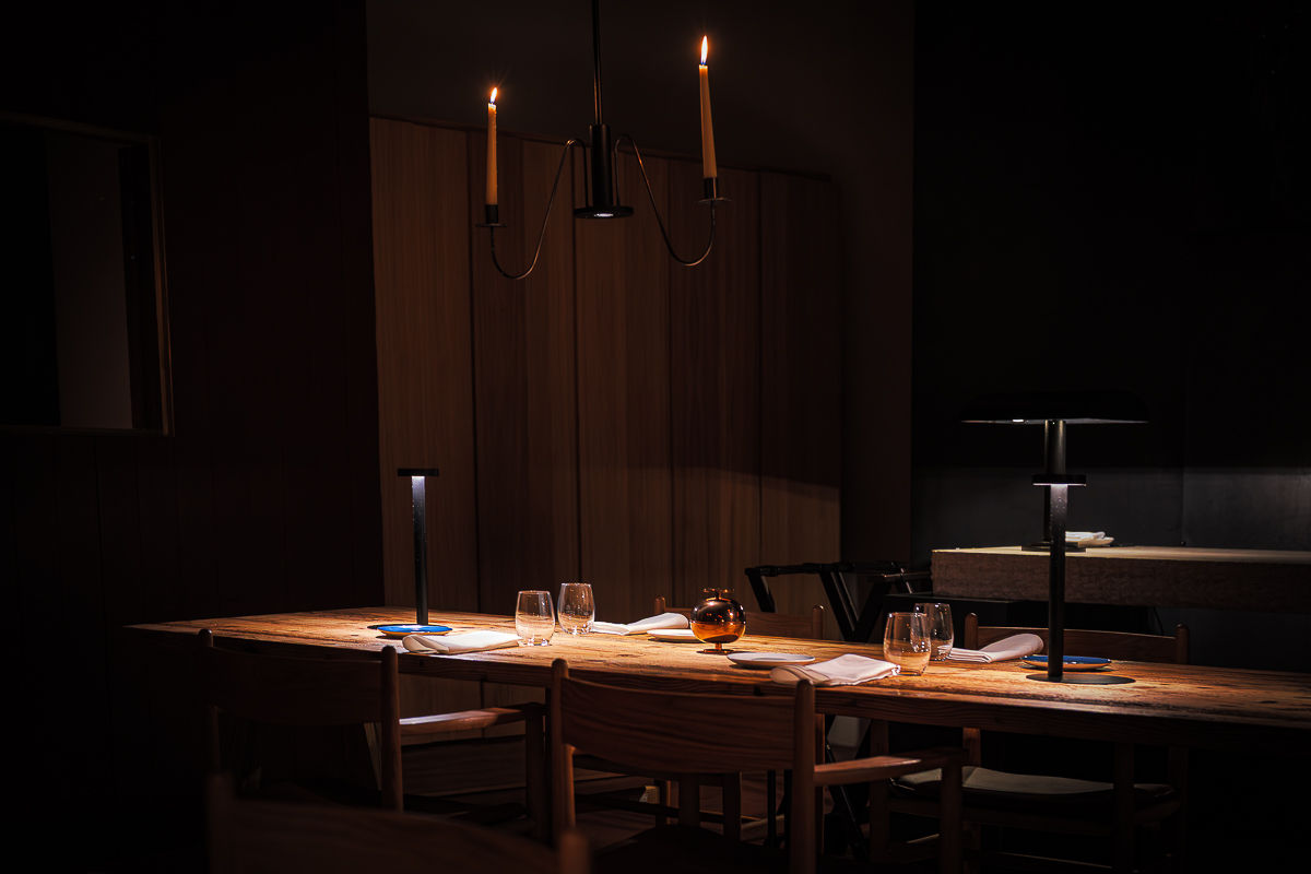Do Gocce chega-se ao restaurante por uma passagem interna, um vislumbre breve da cozinha, dois passos de corredor, e depois a escala muda completamente.