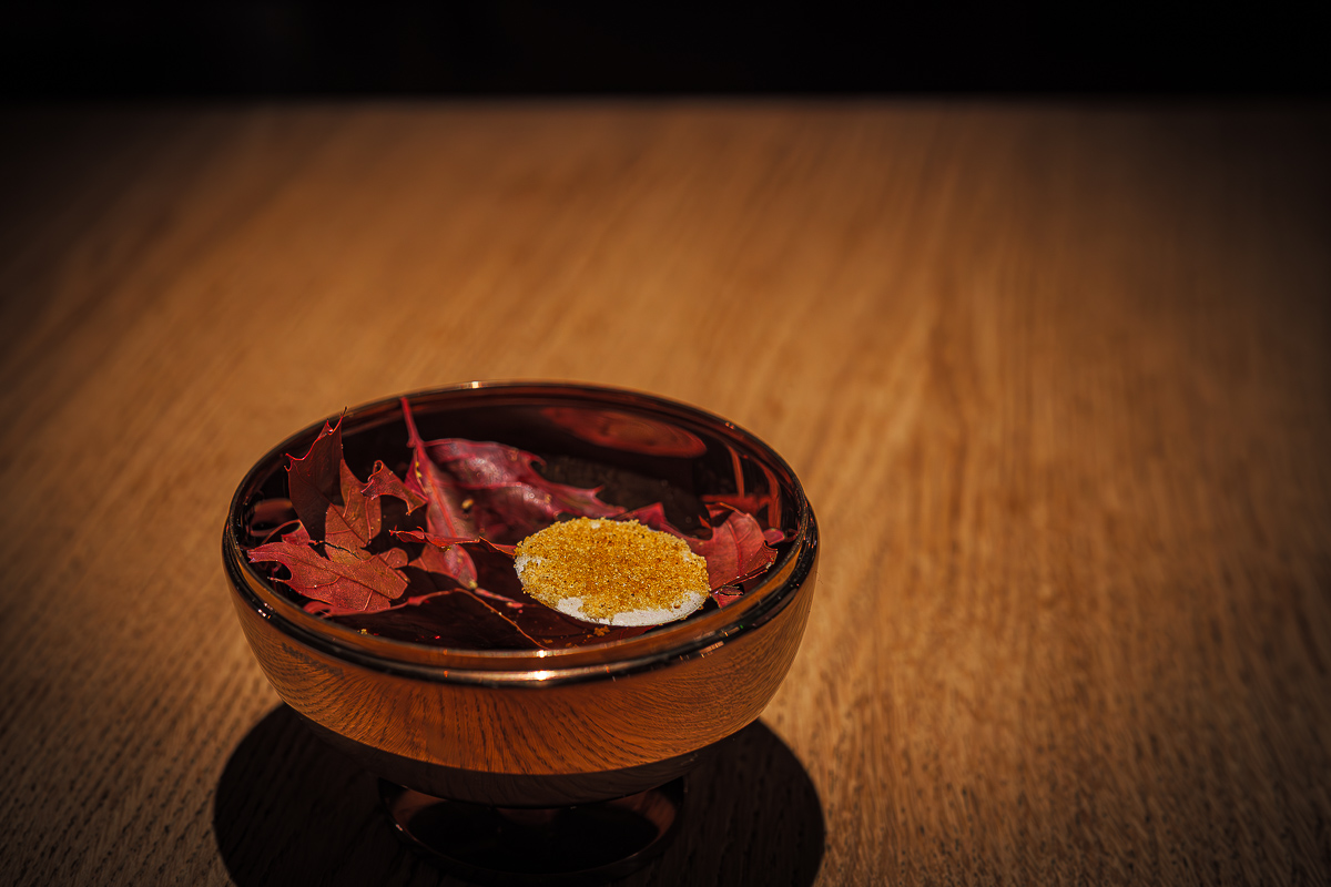 O creme de abóbora assada com espinheiro-marítimo, bagas silvestres e berbigão continua no mesmo ritmo, com uma explosão de cor, e vários elementos contrários que se elevam mutuamente. A doçura da abóbora trabalhada pelas bagas e pela água natural dos berbigões, com o espinheiro-marítimo a fazer um trabalho importante, ao dar aquela acidez laranja e ligeiramente amarga que corta a riqueza da abóbora sem a abafar.