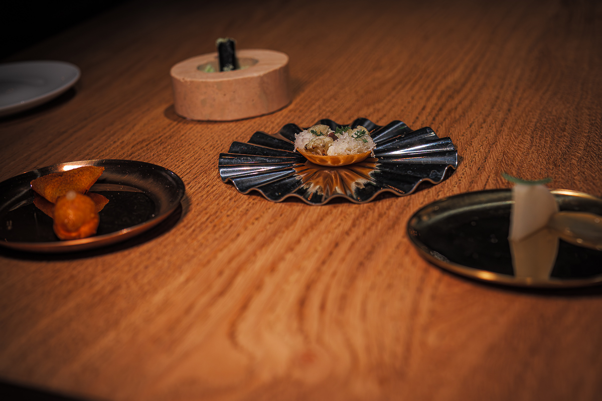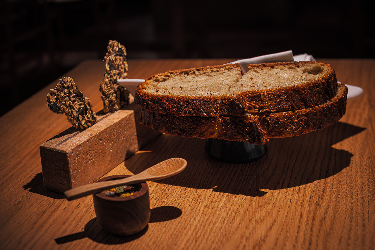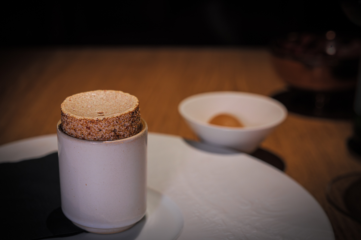 A equipa deixa-nos olhar, não há pressa, a contemplação é também ela parte da coreografia. E quando o espaço já entrou em nós, e os olhos percorreram as abóbadas vezes suficientes, alguém se aproxima, levanta a tampa de um cibório elegante pousado sobre a mesa, e lá dentro está uma óstia. De pó de milho e especiarias. A refeição começa com uma comunhão. Poderia ser um gesto óbvio, mas a escolha é perfeita para este lugar.