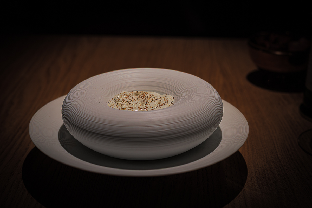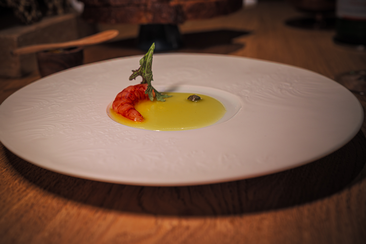 O camarão vermelho de Porto Santo Spirito chega pela mão do chef sobre uma emulsão de mel, azeite e lima verde com alcaparras de Pantelleria e chalota. A cor da emulsão, antes de qualquer garfada, trouxe-me a vinagrete clássica de Alain Passard, aquela que já fiz vezes sem conta no verão, e servi sobre bons tomates. Na boca, confirmou-se: a doçura do mel conjuga-se com a do camarão, a acidez da lima realça sem abafar a delicadeza do crustáceo. Contenção e delicadeza como linha de cozinha. A primeira de várias referências à cozinha de Alain Passard que iriam repetir-se ao longo da noite, e que Ronald me confirmou ser uma das suas grandes inspirações ao lado de Lopriore com o qual o chef se formou.