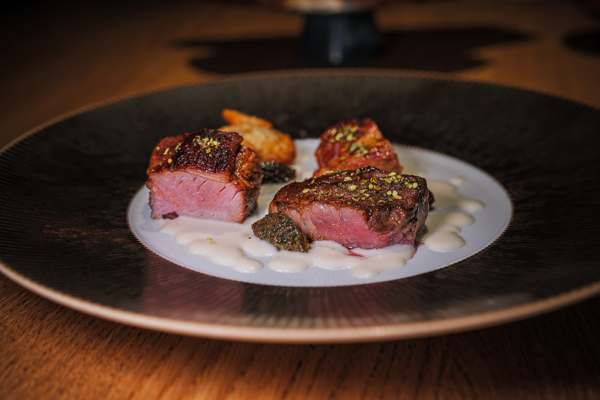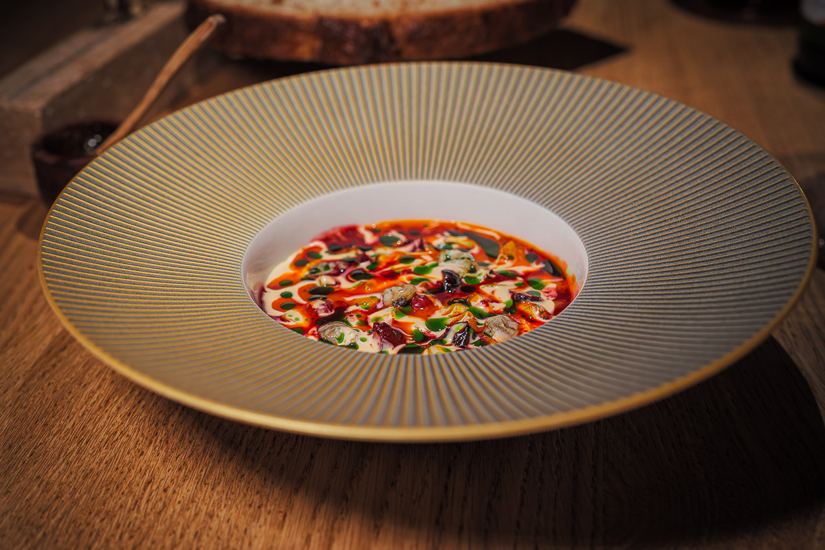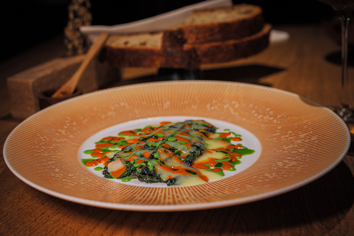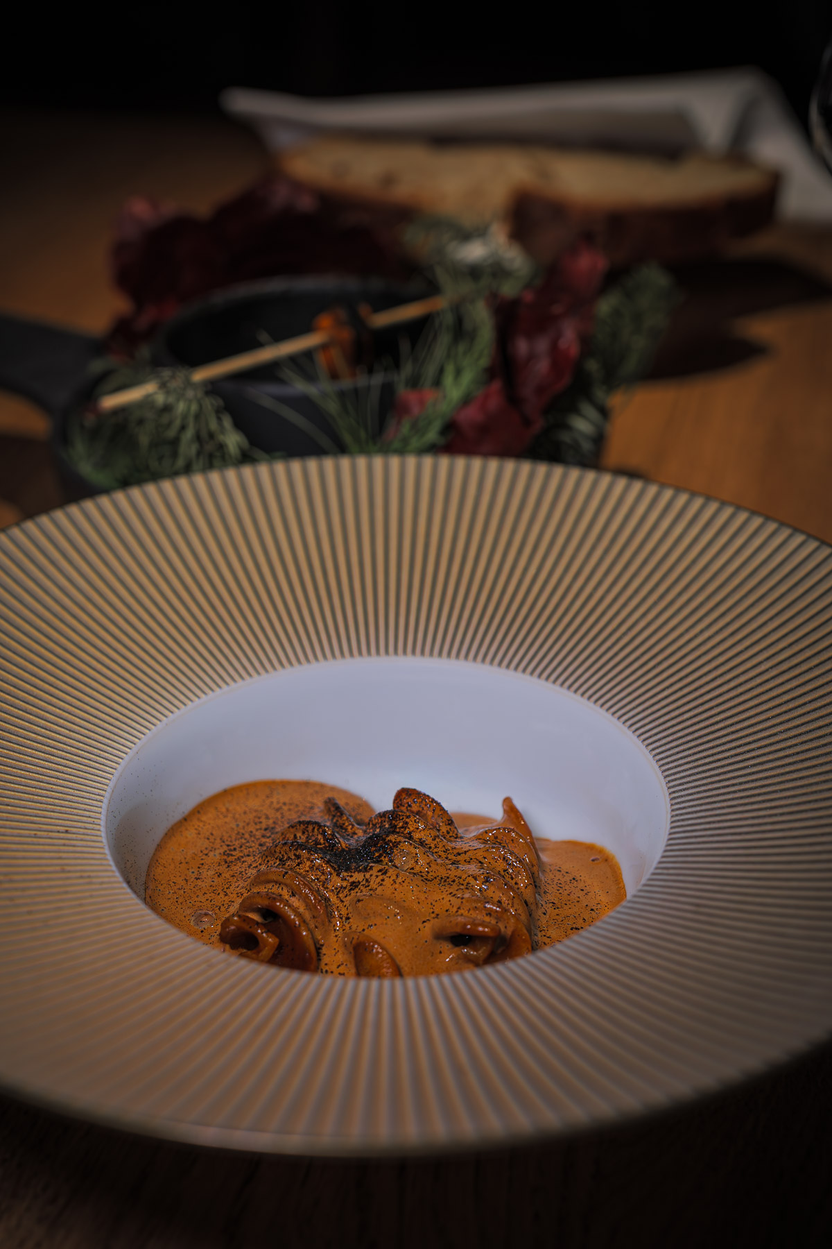 O cavolo nero levemente grelhado vem com três molhos: batata vermelha cozida sobre brasas como se fosse uma vichyssoise, outro de ervas e um de cavala fumada. À primeira garfada pensei em casa – batata, fumo, couve escura, os três pilares do caldo verde. E é o primeiro sabor que me vem à boca, depois a cavala cria toda a distinção e as ervas trazem frescura, com acidez a equilibrar. Um prato umbro que falou português durante um segundo e depois seguiu o seu próprio caminho. Sente-se qualquer coisa de inevitável nisso: um chef albanês criado na Toscana, a cozinhar na Úmbria, a fazer um prato que me cheira a casa. Bukri não cita ou se prende a territórios, absorve-os. E o que chega à mesa é sempre o resultado dessa digestão longa, não a imitação de nenhum lugar em particular.