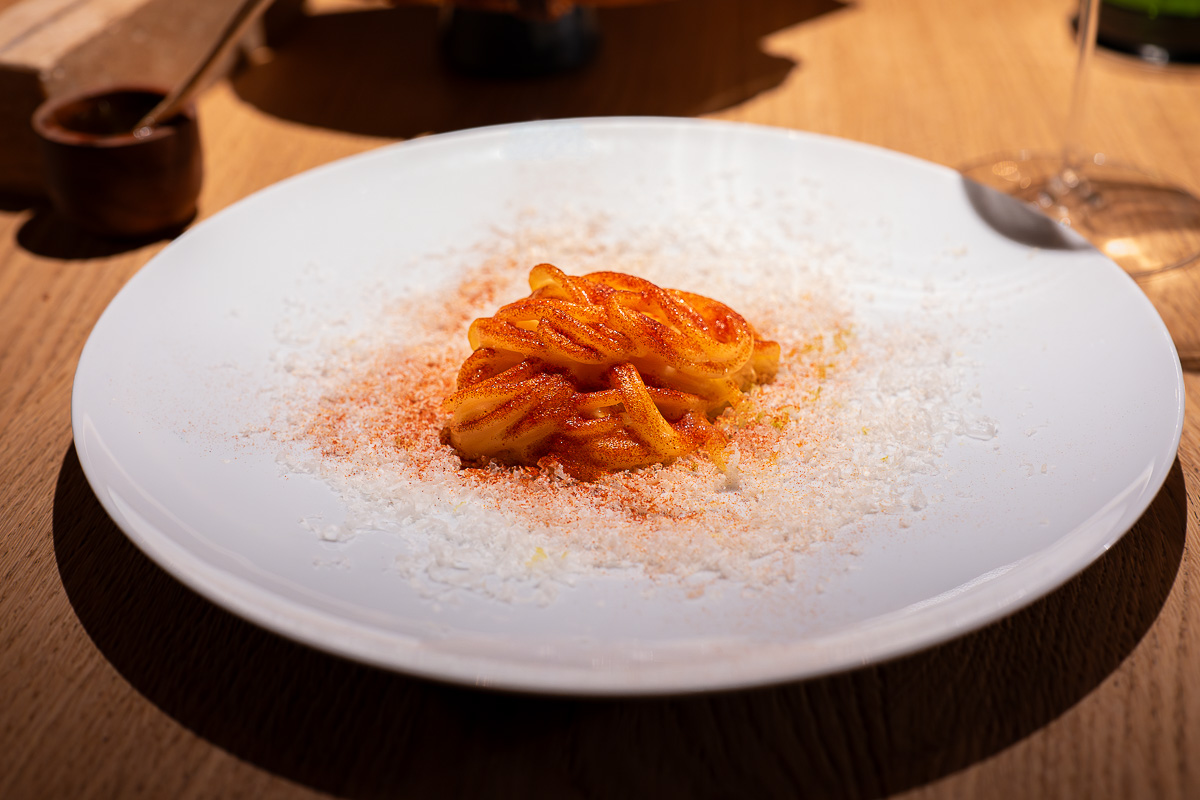 O spaghetto Gerardo Di Nola com manteiga francesa e Parmigiano 36 meses é, segundo o próprio Bukri, um dos dois únicos pratos presentes em todos os menus. Percebe-se porquê. Cheira a Parmigiano e Pimentão de La Vera antes de qualquer garfada, o ponto da pasta é exímio e por fim o limão, descoberto no fundo ao envolver os fios, transforma o conjunto, mais fresco, mais leve, mais depurado. Uma transformação de um clássico, um prato que carrega o suporte dos mestres na cozinha de Ronald. Quem conhece, reconhece, e percebe. Quem não conhece, não precisa saber, é um admirável mundo novo construído com base no passado.