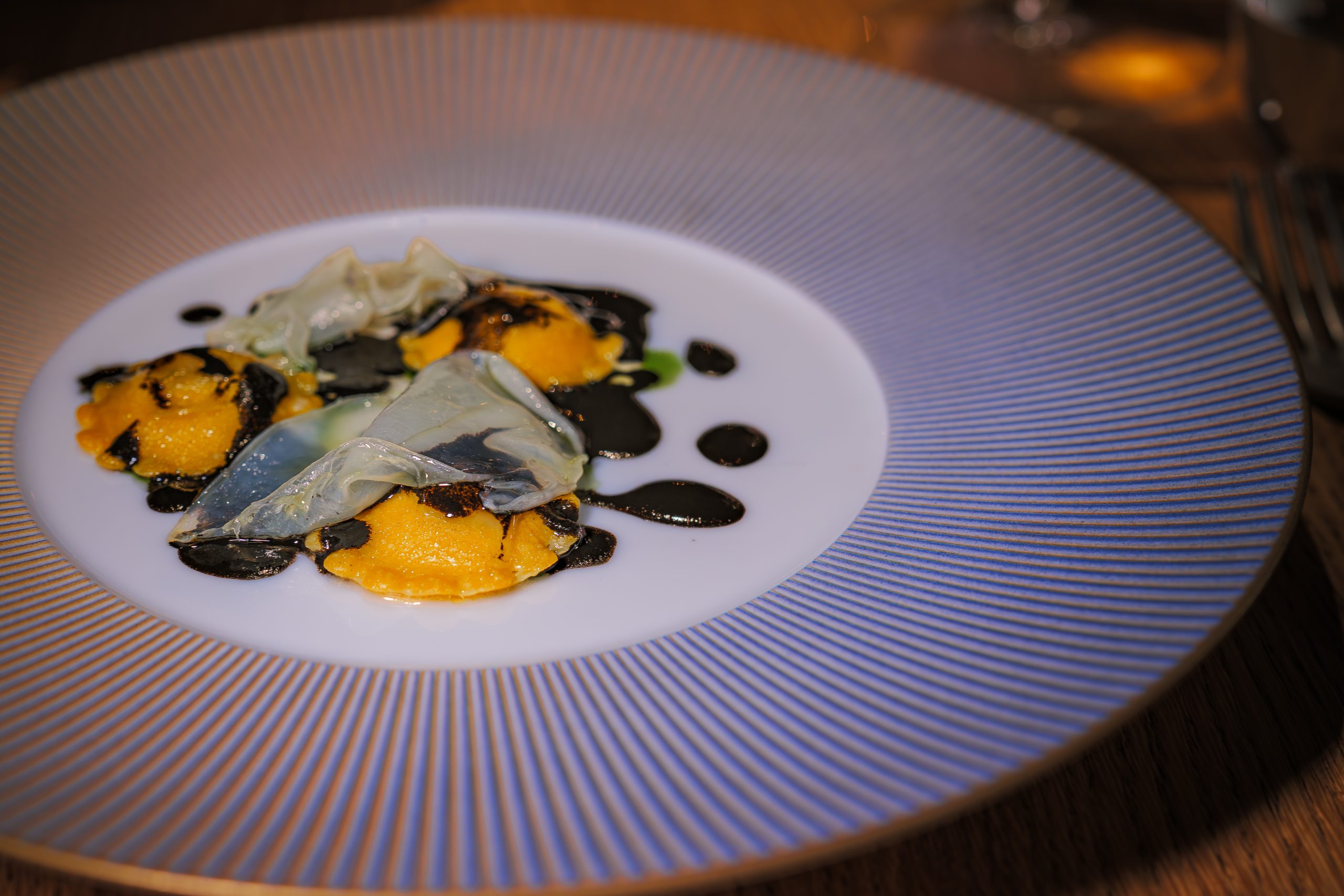 À minha volta a sala continua sob avaliação, os olhares intercalam entre os pratos, a conversa e o espaço, como se todos procurassem encontrar um detalhe novo. Os bottoni de massa fresca recheados com fagiolina del Trasimeno (o feijão do lago) com lulas na brasa e extrato de sálvia chegam com a mesma contenção estética. Massa fina, recheio leve mas marcante, e a lula quase translúcida, minimamente cozinhada, a trazer mar e textura com precisão cirúrgica. O molho de tinta e interiores ancora tudo com profundidade iodada. Um grande prato.