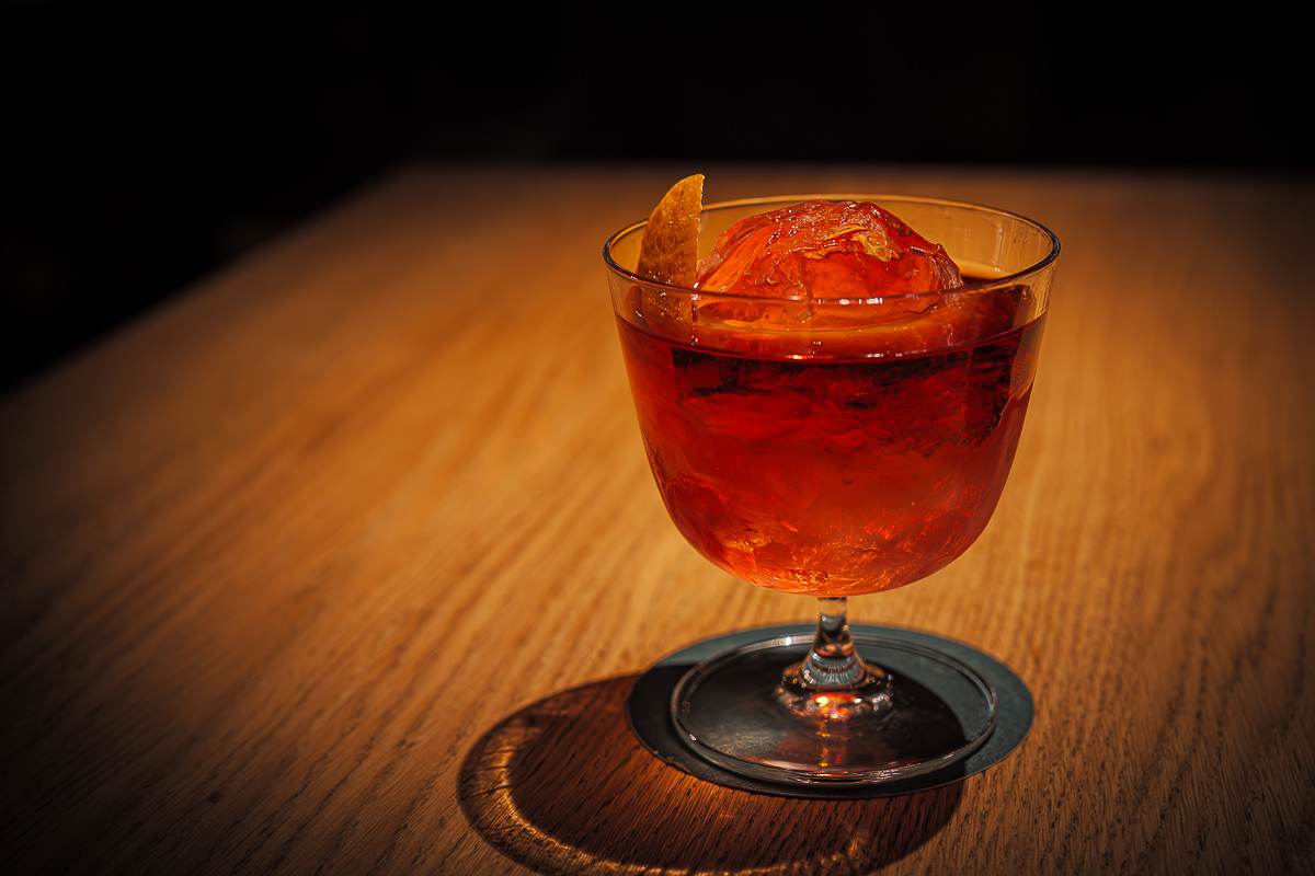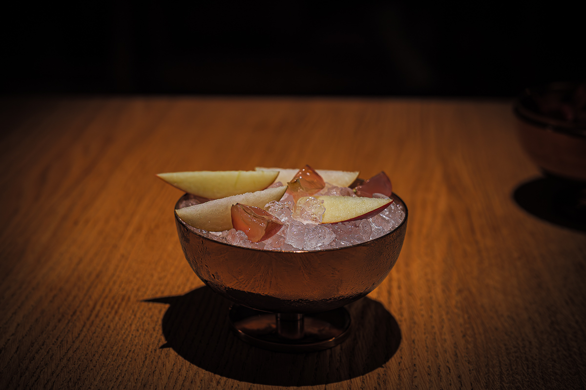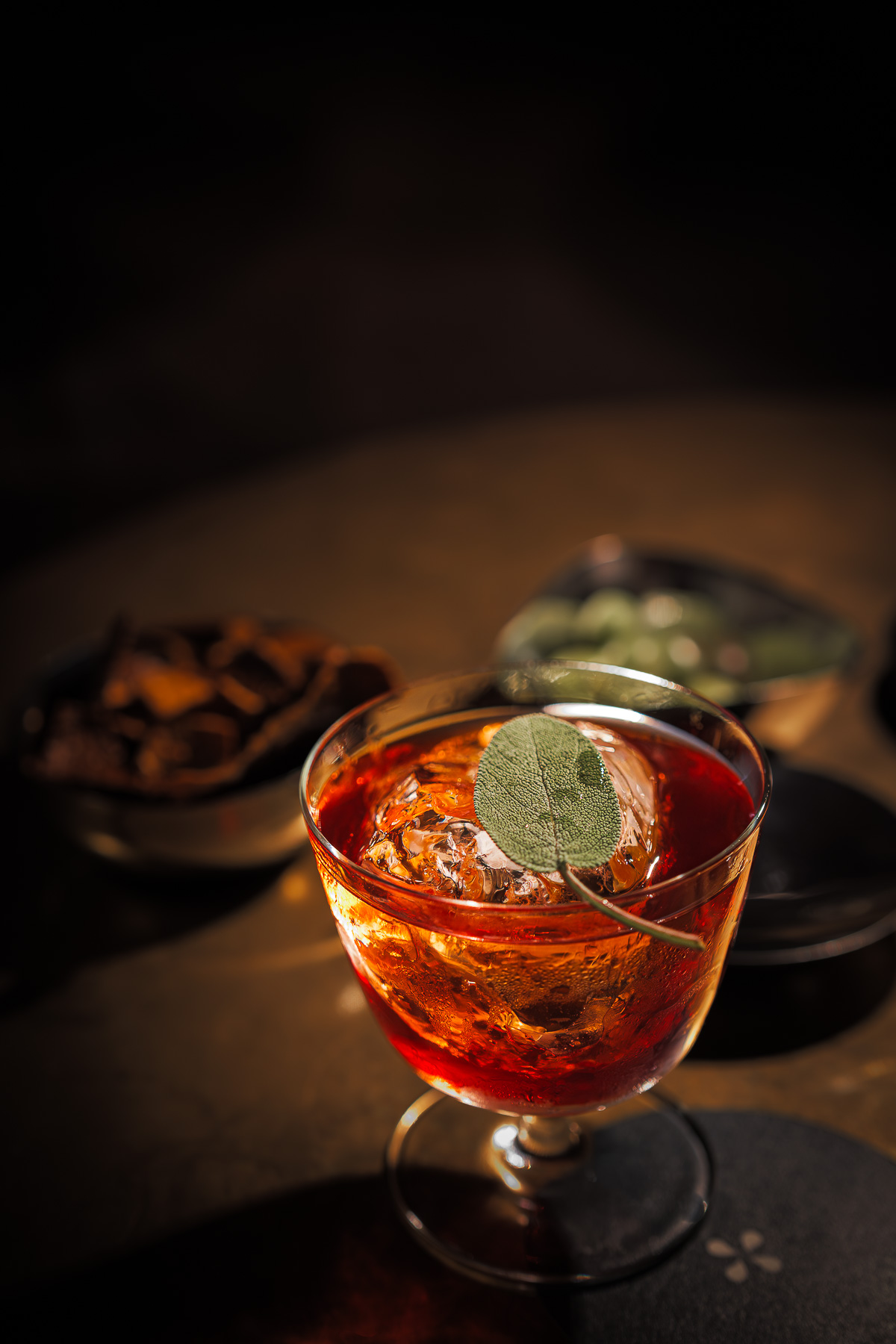 O Gocce é o bar do complexo, num pequeno pátio interior partilhado com o Palazzo Petrvs, o fotogénico boutique hotel que serve de base a tudo. Elegante, histórico, com aquele equilíbrio entre pedra antiga e detalhe contemporâneo que os italianos dominam sem esforço aparente, e que os torna insuportavelmente invejáveis. O bar manager Francesco Cocco assina o L’Oraculo – mezcal, Campari, Punt e Mes, shrub de ameixa e salva, palo santo, que chega acompanhado de azeitonas e crackers de arroz e abóbora, também eles viciantes. Um riff mais complexo do Negroni, com notas agridoces, algum fumo do mezcal e um lado erval refrescante, que entrega um negroni que o negroni não sabia poder ser. Senti o peso de estar sozinho no bar enquanto a equipa se ocupava entre si, absorta em conversas e preparativos, pena que não tenham ouvido o copo vazio, a carta era boa, como comprovou o negroni no final da refeição.
