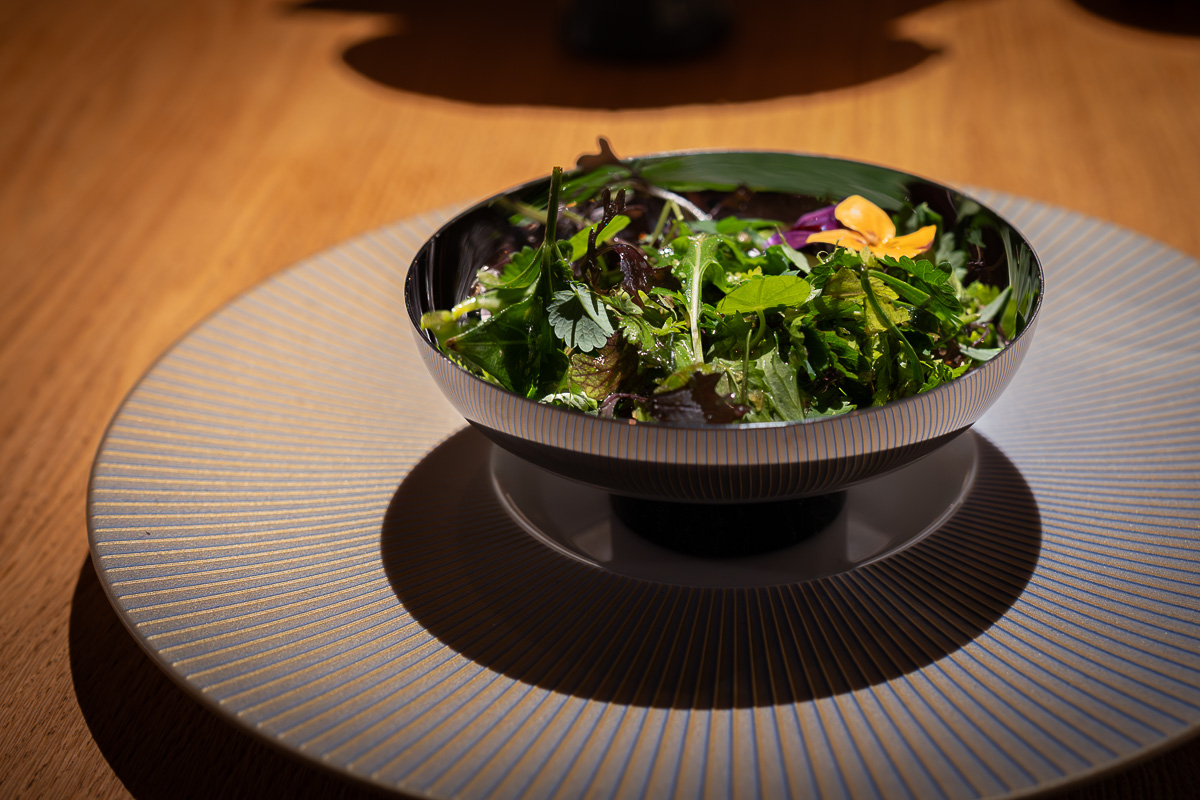 Entre a carne e as sobremesas, chega à mesa uma taça de metal de design elegante. Dentro, uma salada de folhas e ervas repleta de frescura, picância e acidez. Não é um prato para analisar folha por folha. É para sentir como conjunto, com a função clara de limpar o palato depois de um prato rico. Funciona. Na senda de Passard ou Bras, Ronald Bukri trata o mundo vegetal como declaração de marca própria.