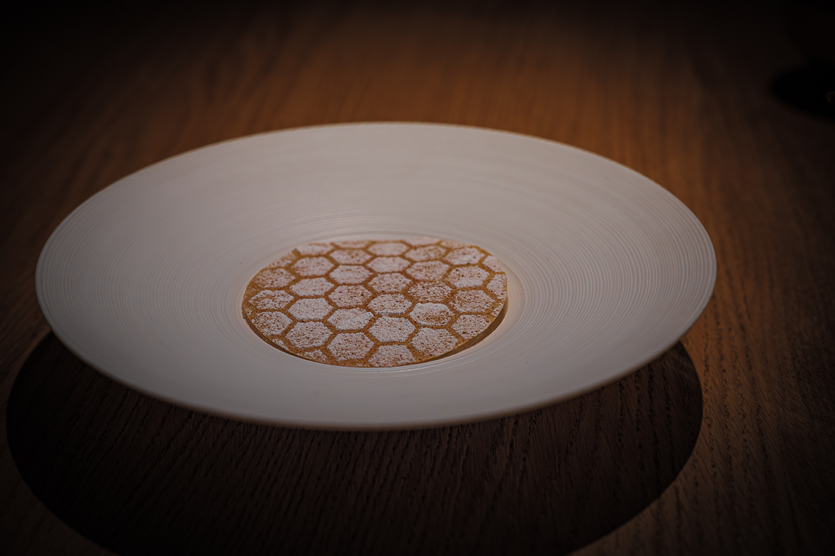 As sobremesas confirmam o mesmo rigor. O creme inglês com mel local, pólen fresco e lima caviar, finalizado com uma cobertura crocante e levíssima em forma de hexágonos de favo de mel. Simples e delicado.