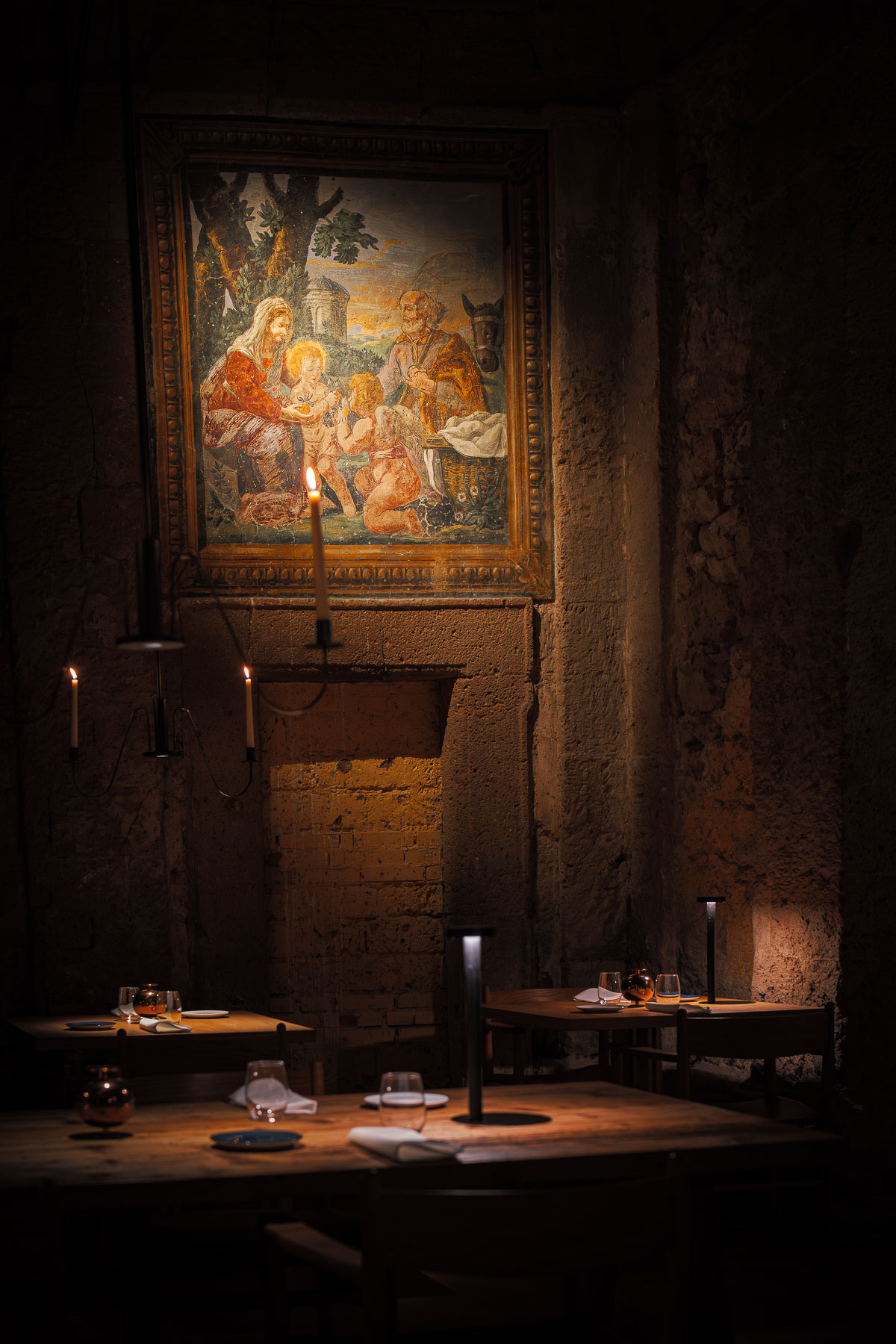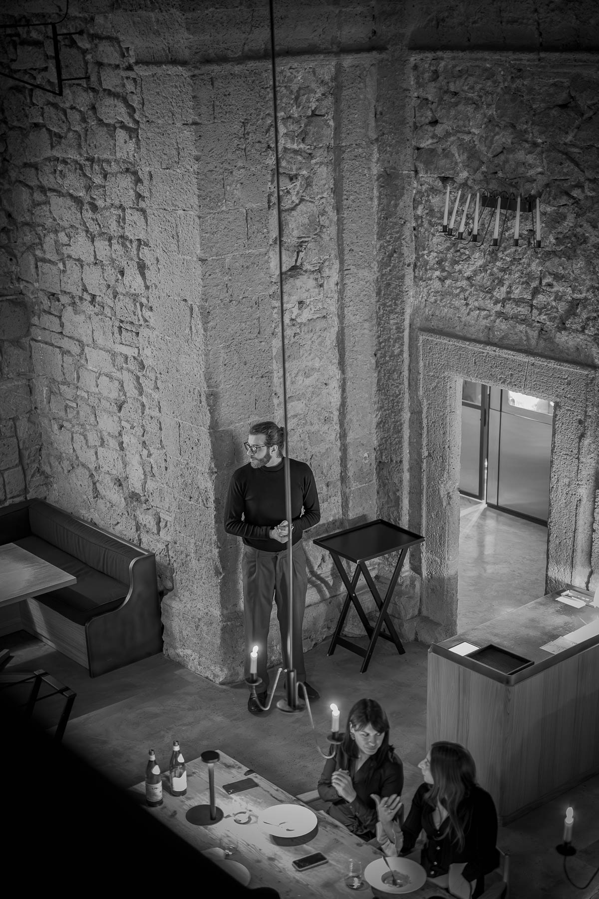 O arquiteto Giuliano Andrea Dell’Uva fez aqui um trabalho raro: a pedra antiga e as peças contemporâneas convivem em plenitude e em Itália, onde o restauro oscila habitualmente entre o museu e o cenário, essa contenção tem um mérito particular. A garrafeira que sobe até ao longo de 9 metros de altura é uma das peças mais impressionantes da sala, imponente, quase escultórica, e ao mesmo tempo funcional: esconde lá em cima a sala privada, revelada apenas a quem sobe. Ao longo da noite, enquanto a equipa subia e descia aquela escada, fui ficando com crescente admiração pela garrafeira e crescente simpatia pela equipa.