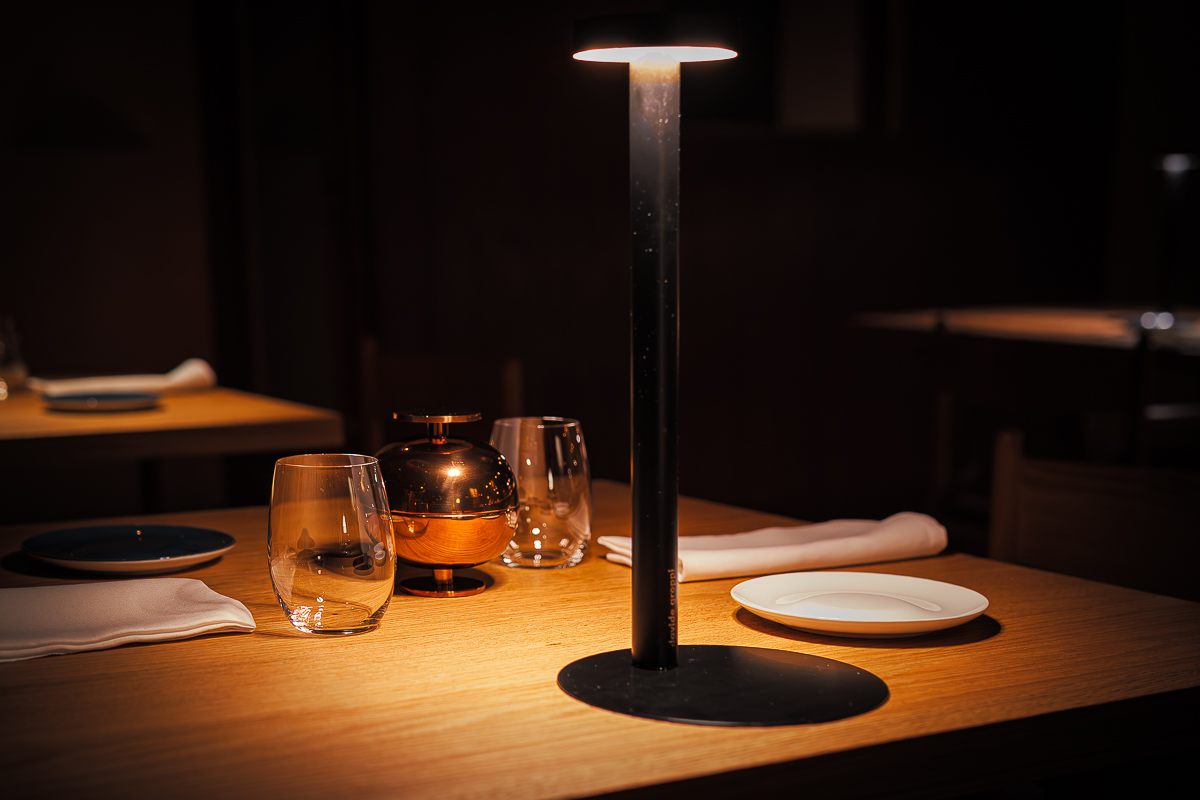 Uma nota que ninguém pediu mas que ofereço na mesma: num espaço com tanta identidade visual, tanto minimalismo deliberado, tanto cuidado estético em cada detalhe, as garrafas de água sobre a mesa assumem um protagonismo decorativo que provavelmente não merecem. A Acqua Panna agradece, mas a estética da sala não.