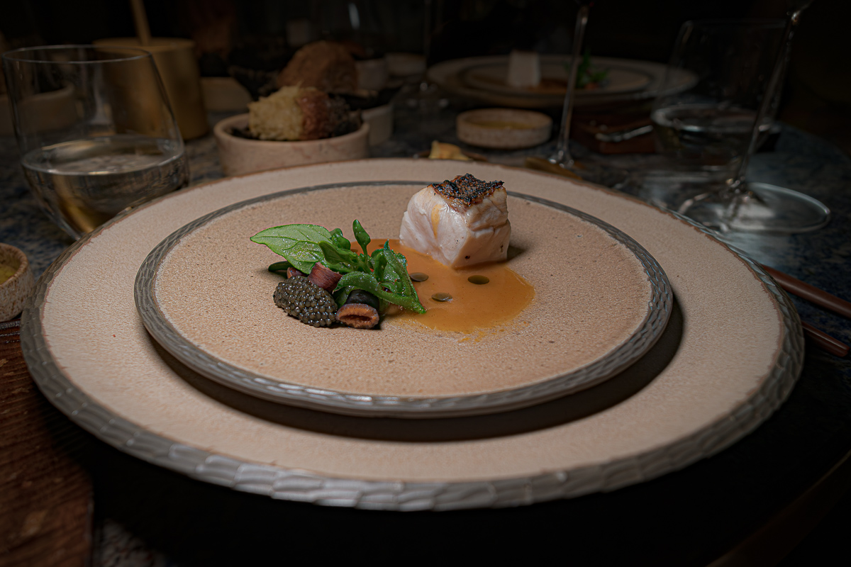 Da lula ao pão, do pão, de regresso ao mar. Cherne com molho de pimento, percebes e caviar. O cherne — rei das águas profundas portuguesas — cozinhado com exatidão. O molho de pimento, cremoso e levemente fumado, serviu de base terrosa; os percebes destacaram-se em textura e sabor mineral. O caviar não foi mera decoração. Há ali uma portugalidade latente que me trouxe memórias de Verão, brasas, sabores de infância.