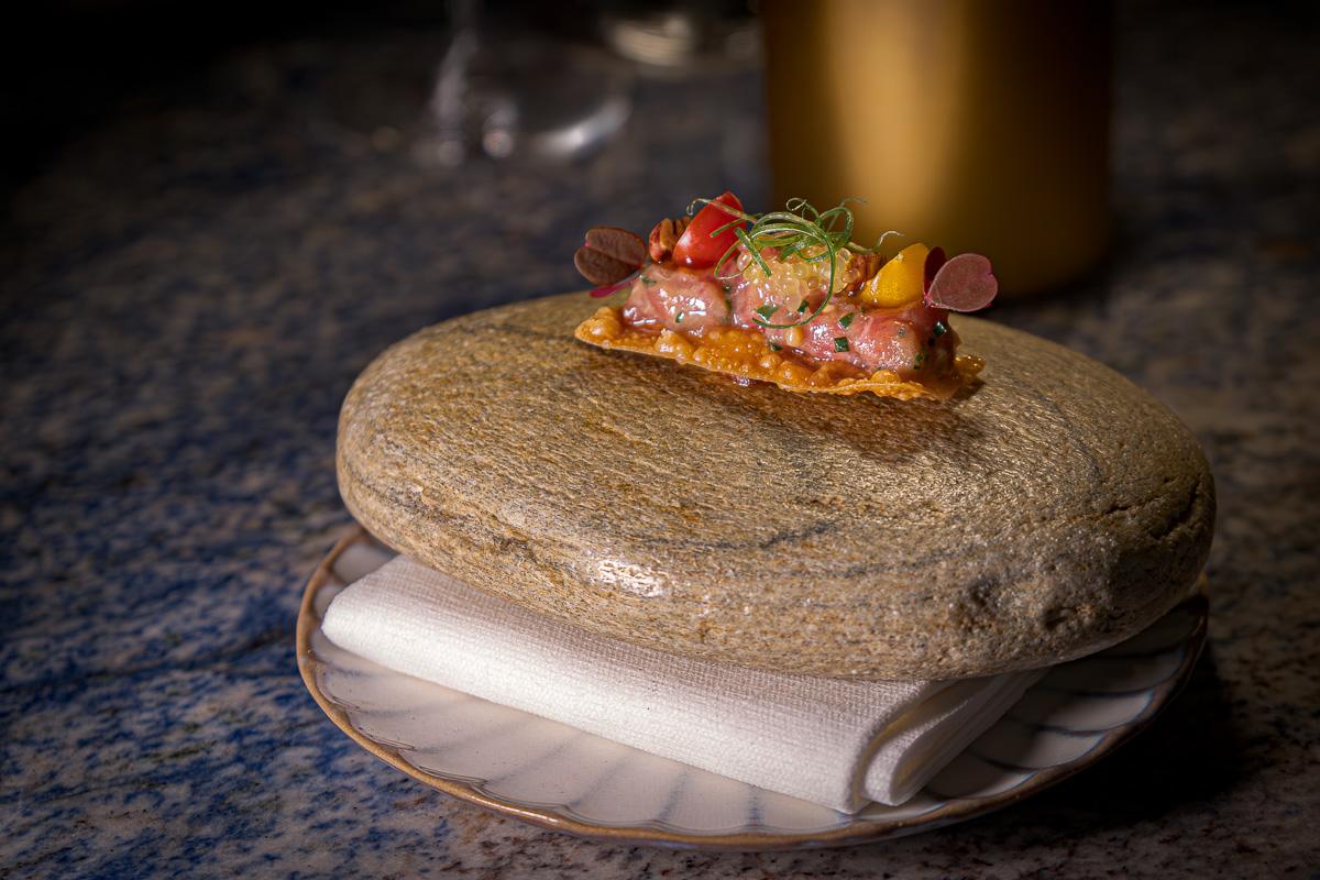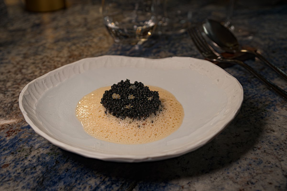 Começamos com champagne – Pierre Gimonnet & Fils – e os primeiros snacks. O atum rabilho com noz pecan e lima caviar chegou sobre uma massa tipo coscorão. Um encontro inesperado entre produto português e o mundo. A noz pecan — ingrediente que nenhum chef português tradicional consideraria ao lado de atum — trouxe doçura tostada que amplificou a untuosidade do peixe. O caviar de lima rebentou em pequenas explosões cítricas. Funcionou.