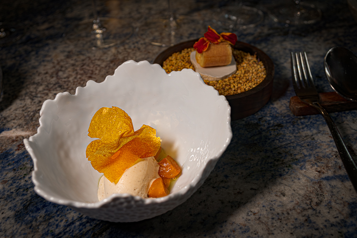 A verdadeira surpresa foi a couve-flor com alperce, chá preto e lavanda. Couve-flor em sobremesa. Poderia ter sido um desastre conceptual. Foi uma revelação. A couve-flor, trabalhada para revelar a sua doçura natural, transformada em gelado — delicioso, cremoso, textura impecável. O alperce trouxe acidez, fruta e a marca necessária de Verão. O chá preto deu profundidade tânica. A lavanda, usada com mão leve, ofereceu apenas um sopro aromático. Tudo aparentemente simples. Tudo muito bom.