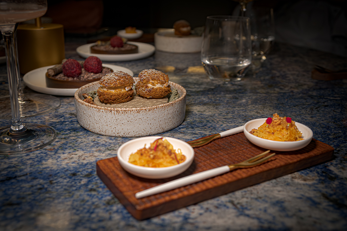 Se a carne foi tímida, as sobremesas foram o oposto. Ananás com camomila e espumante: diferentes texturas da fruta, diferentes temperaturas, delicadeza floral e notas de espumante. Refrescante, complexo, inesperadamente sofisticado.