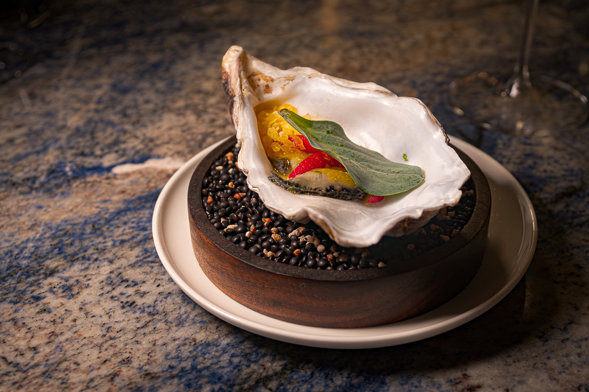 Ostra com citrinos e raiz forte. A raiz forte despertou o palato sem excessos, os citrinos trouxeram acidez e equilíbrio. Prato de reset — limpava o palato antes do que viria a seguir.