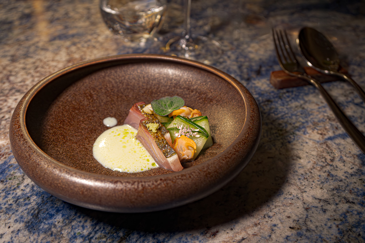 Encharéu com pepino, berbigão e wasabi. Pele tostada, e um leve crocante ao passar da faca; por baixo, carne ainda húmida, translúcida no centro — aquele ponto e técnica japonesa infalível. O berbigão trouxe sal e textura, o pepino frescura verde. O wasabi, fresco, deu picância suficiente para despertar e aromatizar os sentidos. O Leche de tigre por baixo a dar acidez e unir tudo. Este foi dos momentos altos da noite.