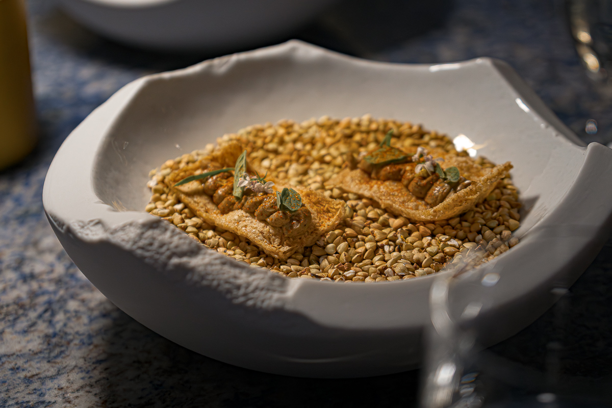Aqui reside uma das grandes surpresas da noite. O pairing não-alcoólico está entre o melhor que se pode encontrar em Portugal. Diria mesmo além-fronteiras. O soro de chá verde com nori, sudachi e pimentos foi de complexidade rara: umami vegetal, acidez cítrica, frescura herbácea, tudo em equilíbrio perfeito. A beterraba com hibiscos, cardamomo e cravinho ofereceu profundidade terrosa e especiada. E o amendoim com tremoço — combinação que só poderia ser portuguesa no espírito mas global na execução, foi simultaneamente reconfortante e surpreendente.
