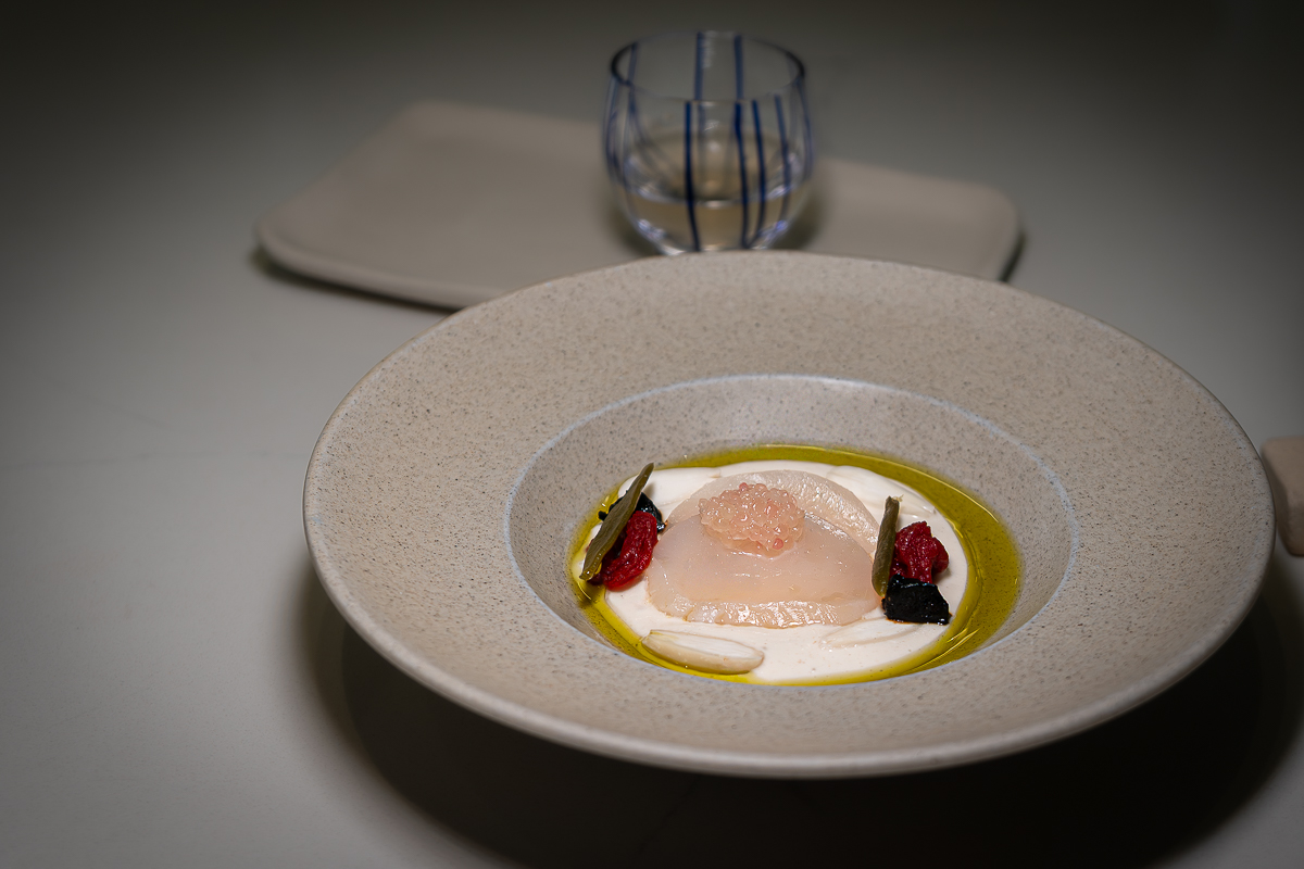 The ajoblanco is creamy yet light; the sea arrives through the scallop; the lime’s acidity cuts through everything, preventing the almond from becoming heavy. The tomato raisins bring concentrated sweetness. And the black garlic hovers like a shadow – present, but discreet. It’s edible poetry.
