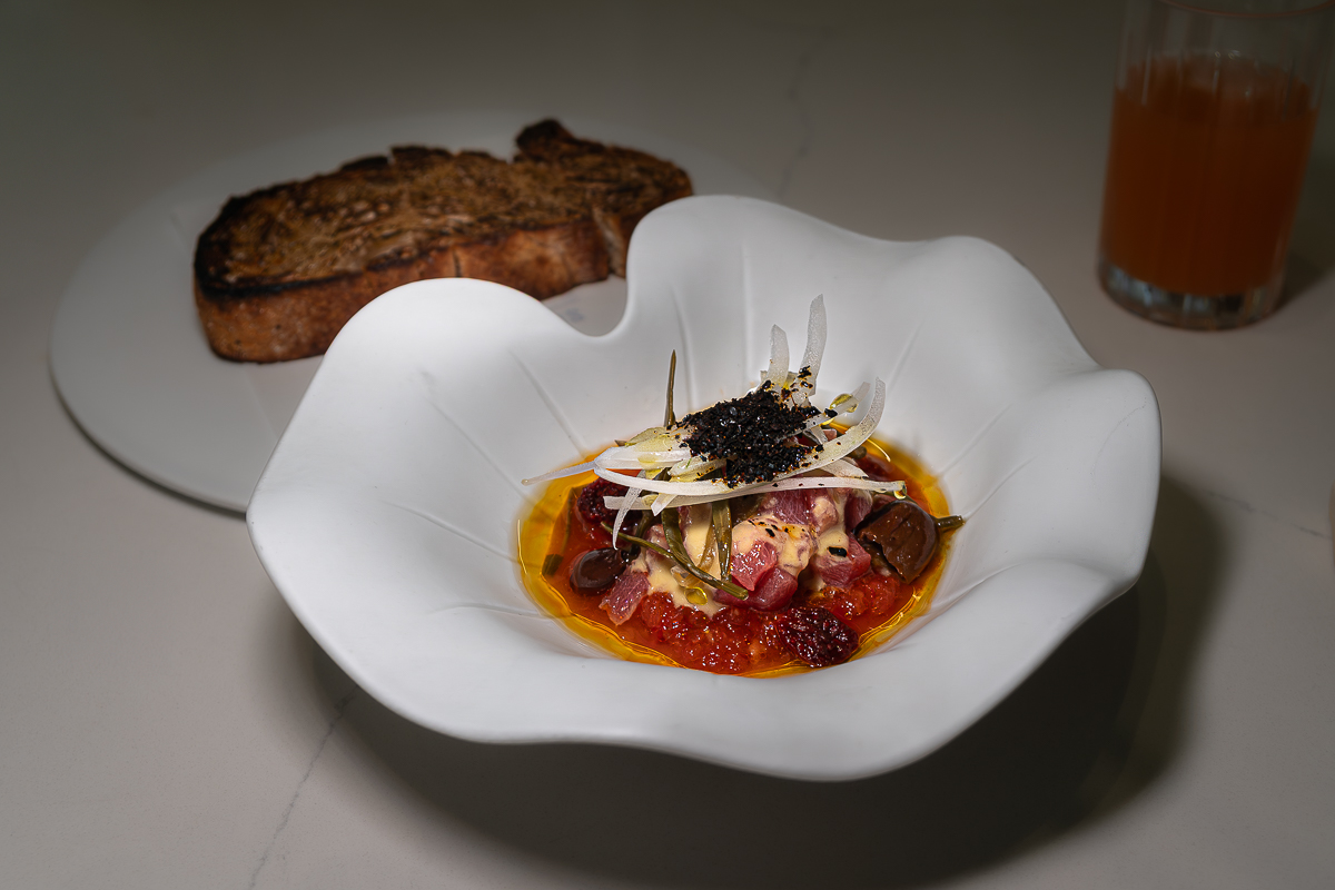 Different parts of tuna, mixed with the remaining ingredients – fermented tomato, sea fennel, garlic, aji rocoto (Peruvian chili), tomato raisins, olive oil, and onion – and served with delicious sourdough toast.