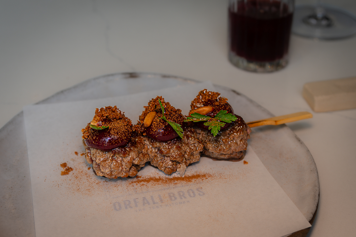 A minced wagyu kebab, sour cherry cream, parsley, cinnamon, and pine nuts.