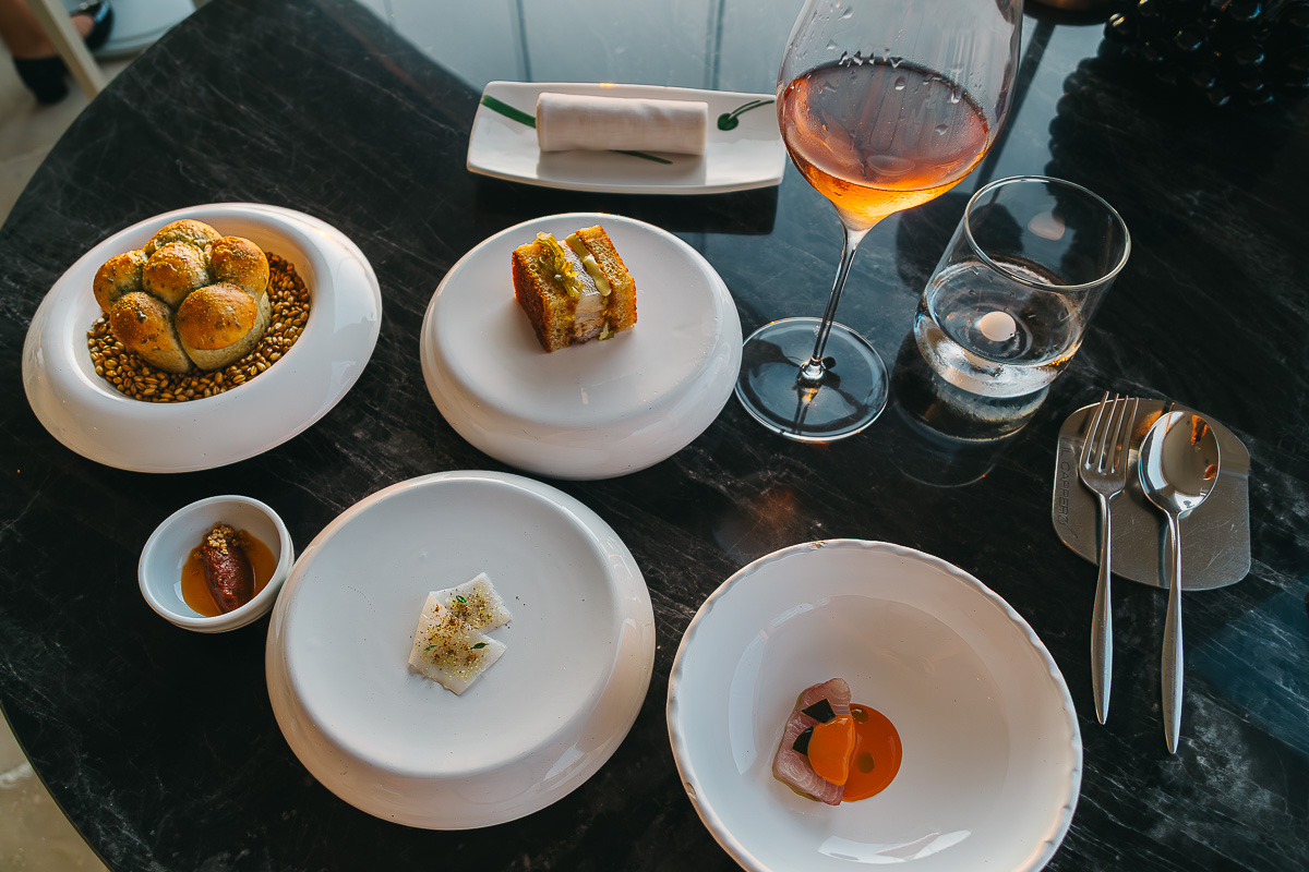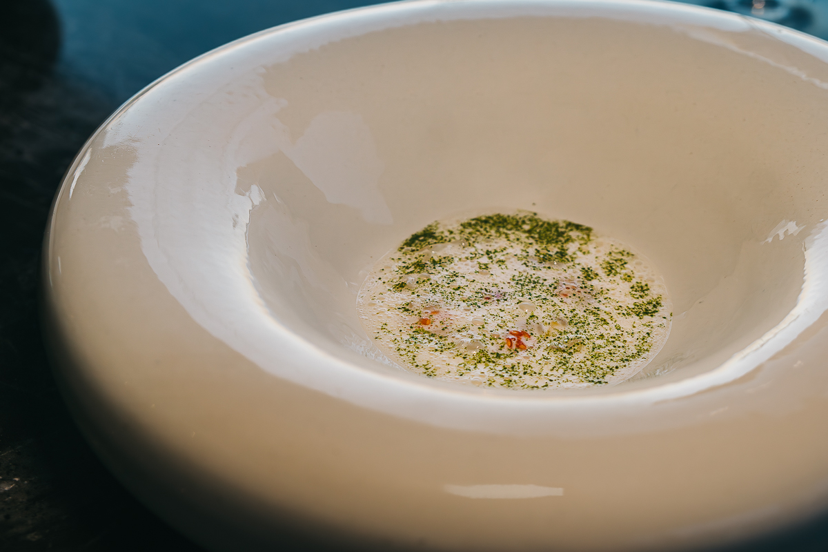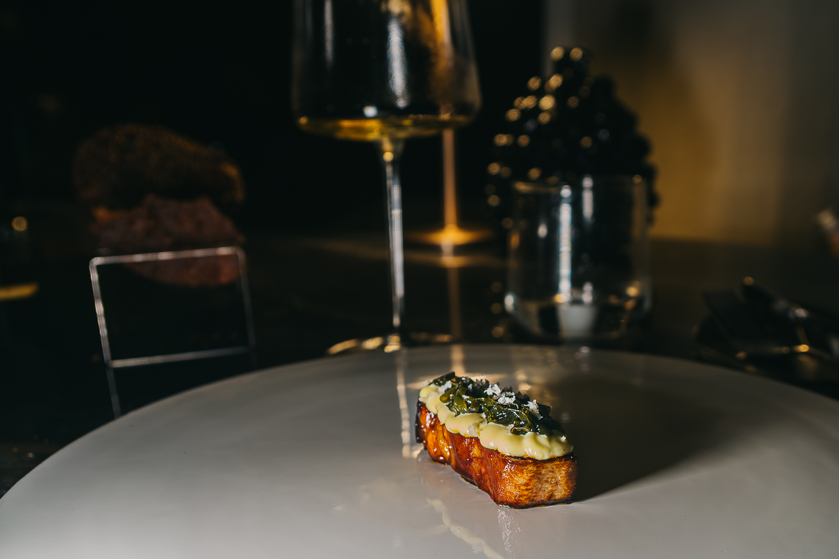 E depois chega um brioche tipo katsu sando, recheado de barriga de porco, que te diz… bem, não sei exactamente o que diz! Talvez “o chef também gosta de comida de conforto”? Ou “precisávamos de algo para os clientes que têm medo de peixe”? É saboroso, não nego, mas num menu que aparentava falar uma língua só — mar, sal, acidez — este snack aparece como um convidado bem-disposto que chegou à festa errada.