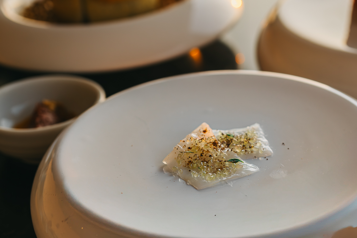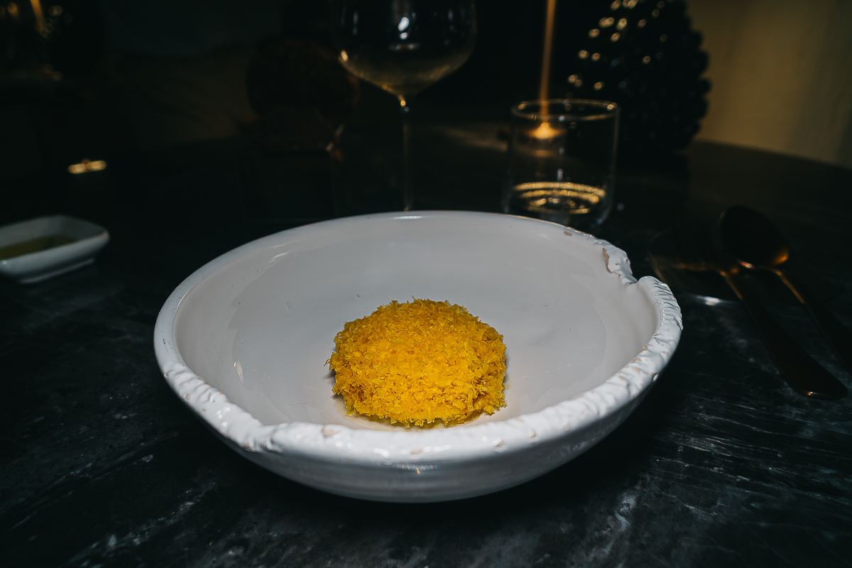 O menu mais longo começa com uma sequência de snacks que estabelece de imediato a linguagem: simplicidade visual, intensidade de sabor. Um lírio com folha de alcaparra (alcaparra essa que dá nome ao restaurante) e molho de tomate datterino abre com delicadeza, o amargor vegetal a equilibrar a doçura do fruto. Uma lula curada em sal, finger lime e limão negro — a resposta italiana ao sashimi, com energia cítrica que nos acorda o palato. E depois, um atum fresco envolto em óleo de tomate e bottarga que se torna viciante: era impossível não barrar aquela quenelle perfumada na focaccia, uma, duas, três vezes, até não restar nada.