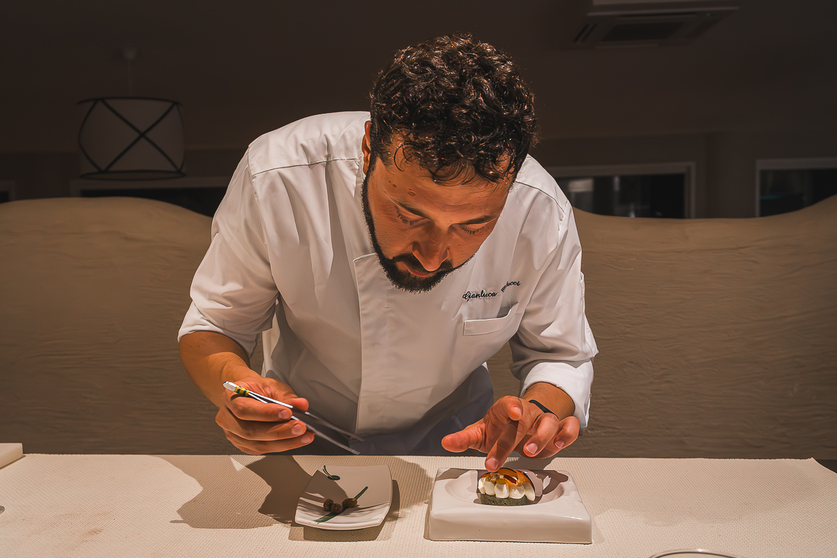 Como disse, a sala do Il Cappero abre-se inteiramente para o mar. Duas ilhas ao longe, os faraglioni recortados contra o céu, e, na noite em que jantei, um pôr-do-sol que durou a eternidade necessária. Neste contexto, os pratos de Pagnotto não competem com a vista; chegam, são comidos, e desaparecem a bom ritmo. Despojados, directos, quase tímidos na apresentação, deixam na memória o sabor, não o empratamento. Uma escolha que revela uma maturidade rara para um jovem chef. E talvez seja essa a maior surpresa do Il Cappero: não a técnica (esperada, dado o currículo), não a sustentabilidade (louvável, mas cada vez mais comum), mas a contenção. Saber o que não pôr no prato é, muitas vezes, mais difícil do que saber o que pôr, especialmente na juventude.
