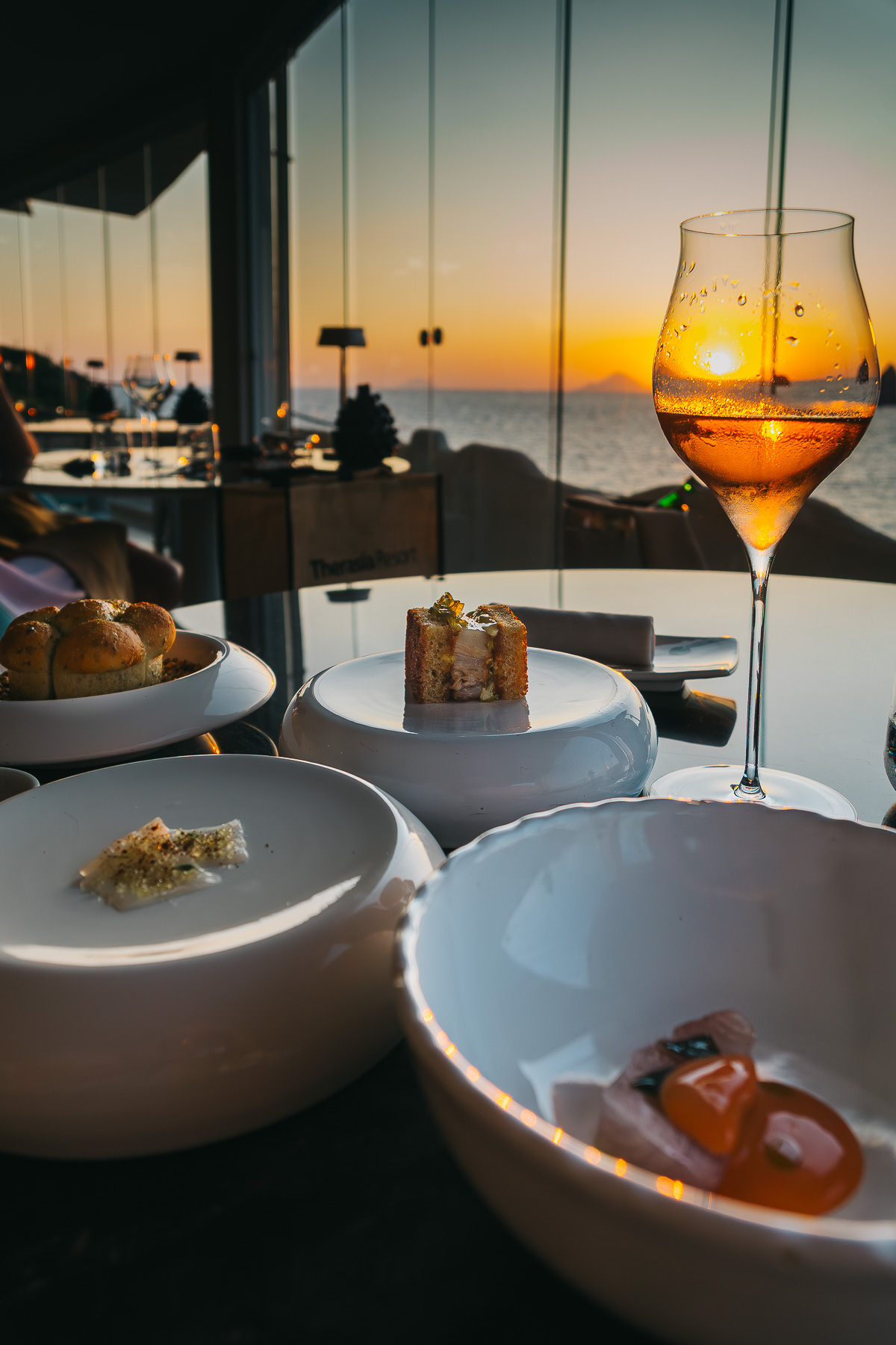Sentei-me junto à janela e durante os primeiros minutos não consegui olhar para o menu. O sol estava a descer sobre o Tirreno, lento, como se soubesse e quisesse ser observado. A sala do Il Cappero é uma caixa de vidro suspensa com o mar aos nossos pés, a ilha de Lipari e dois faraglioni ao longe como sentinelas de pedra, guardiões de um pôr-do-sol que durou quarenta minutos e passou por todos os tons. A decoração é quase inexistente: paredes claras, mesas espaçadas, nenhum quadro a competir com a paisagem. É uma escolha inteligente para um lugar assim — aqui qualquer objecto decorativo seria uma redundância, ou pior, arrogância.