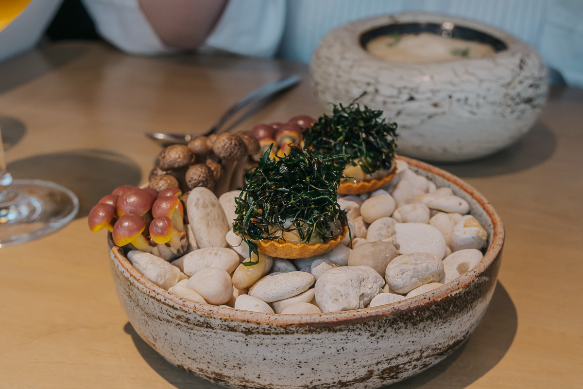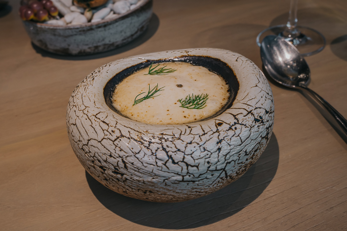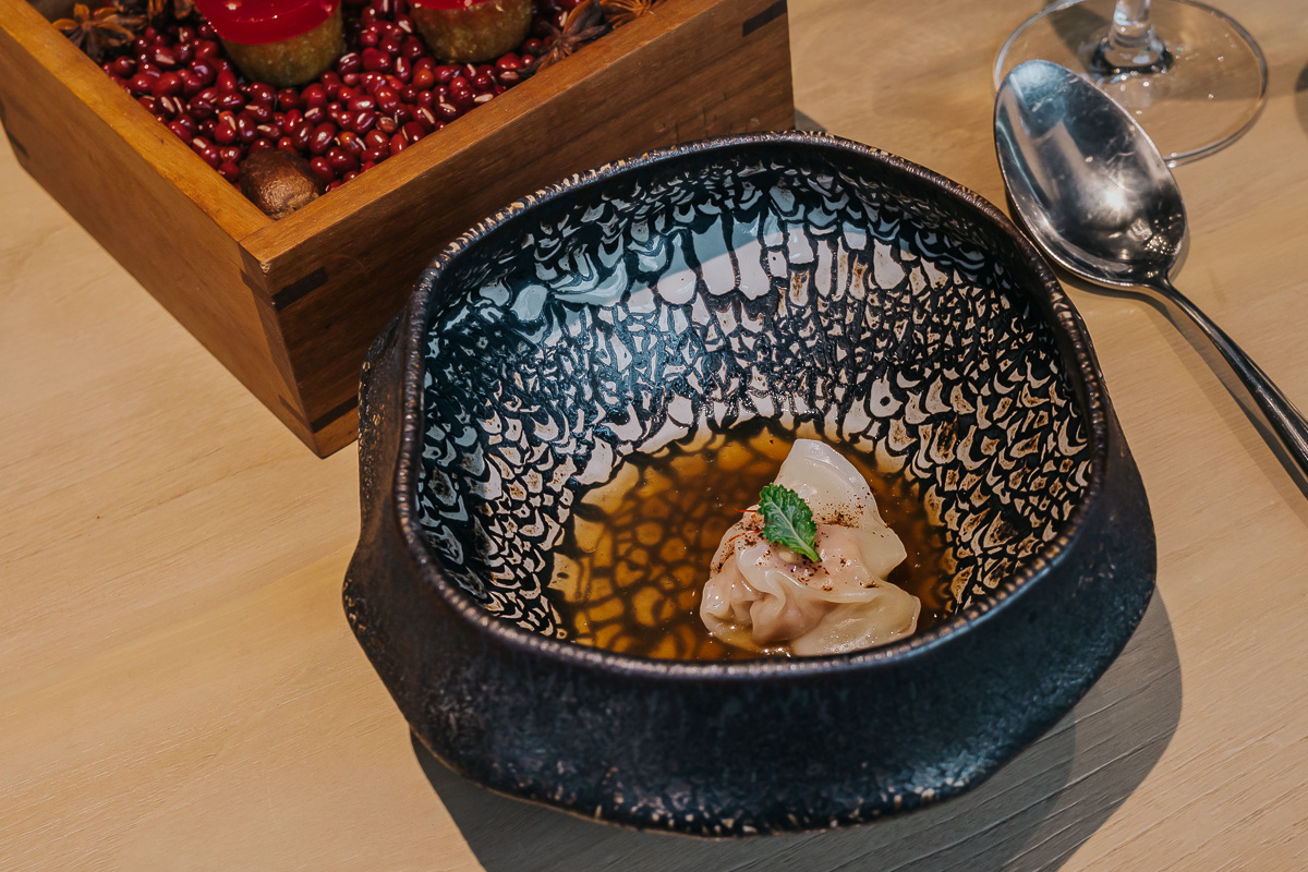 A refeição começa com uma sequência de snacks. Primeiro, uma aveludada mousse de peixe fermentado com barracuda fumado, seguida de uma tartelete de cogumelos e caril com lima kaffir, uma combinação com belas notas de acidez. Depois, uma reinterpretação visual e divertida de uma sopa de noodles instantânea, e por fim, um dumpling de porco num caldo reconfortante – uma entrada quente e acolhedora que antecipa o rigor técnico e a intuição gastronómica do chef.