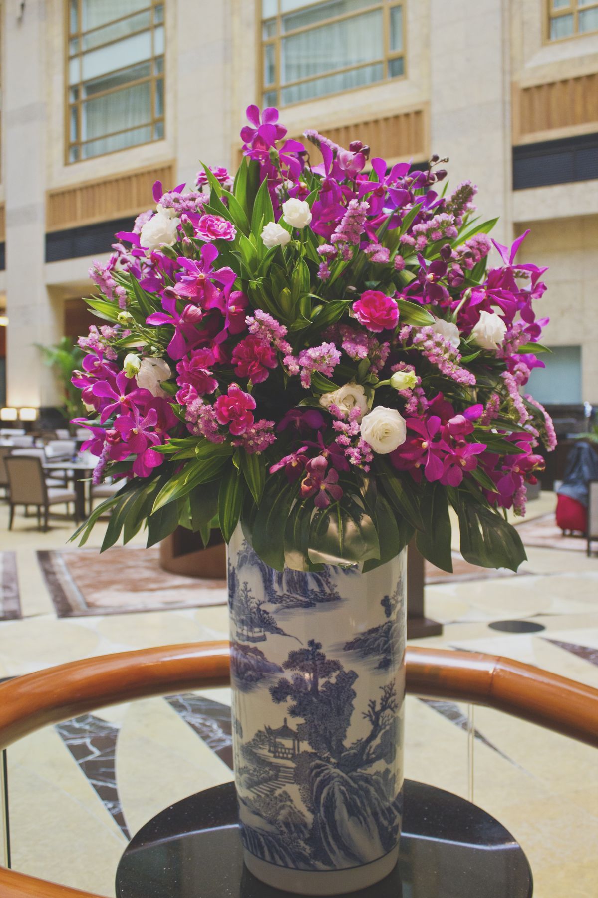 Os materiais nobres utilizados nos acabamentos, a luz natural, as contrastantes peças de arte contemporânea que decoram o espaço e os magistrais arranjos de flores deixaram-me completamente rendida. Assim se entra num dos mais grandiosos hotéis de Singapura!