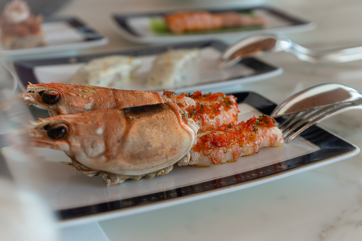 A refeição começou como deveria começar qualquer celebração do mar: Champagne (neste caso Ruinart Blanc des Blancs) e uma selecção de antipasti para partilhar. Ostras, vieiras, lagostins, camarões tigre, lírio, e o famoso gambero rosso de Mazara del Vallo chegaram à mesa como quem apresenta credenciais. Praticamente nada cozinhado. Apenas o melhor que o Mediterrâneo tem para oferecer, disposto com elegância quase cirúrgica.