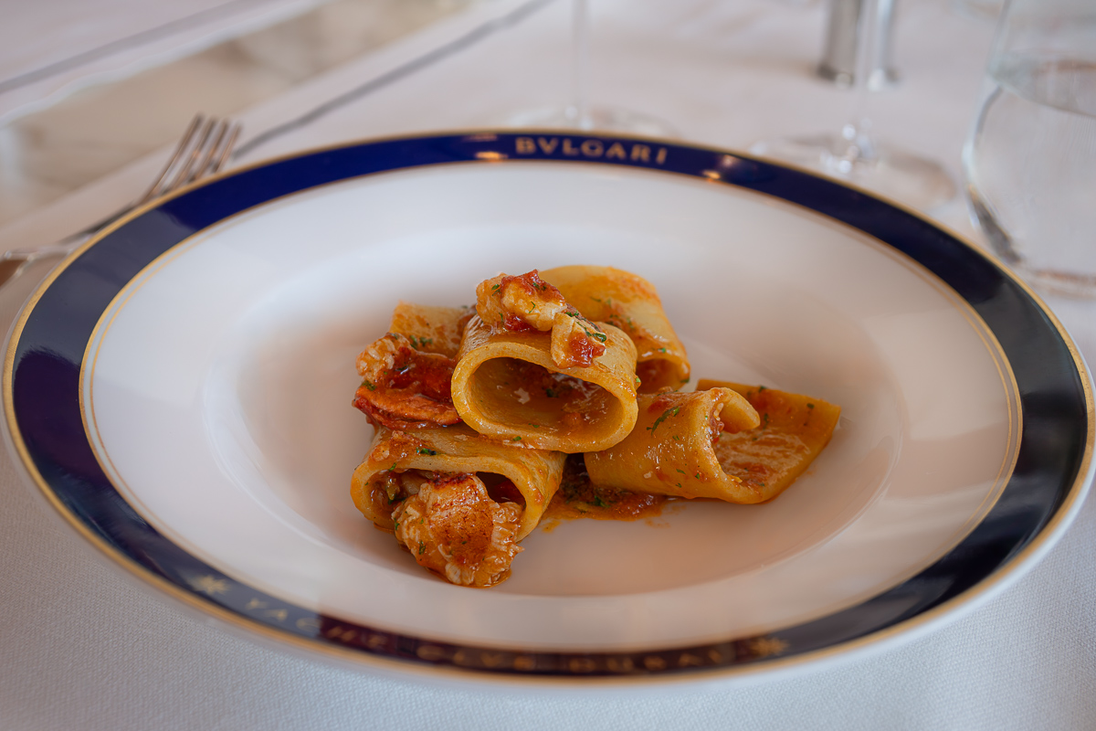 Depois veio o paccheri de Gragnano com molho de lavagante. A pasta chegou como faço em casa nas noites boas: molho espesso o suficiente para aderir aos tubos de paccheri, mas não tanto que afogue o sabor a mar e a doçura do lavagante.