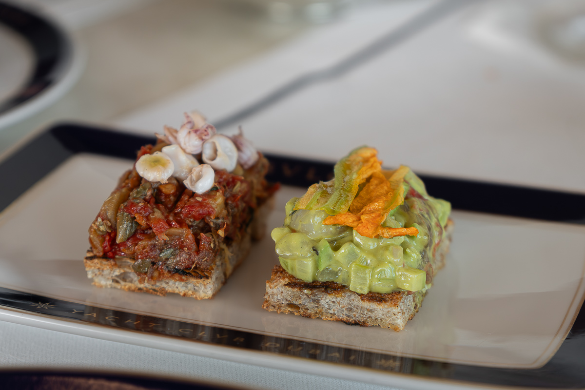 Destaque absoluto para duas coisas: a bruschetta de flor de courgette e gamba, crocante e suculenta, vegetal e marinha. Comeria uma dúzia. E o crudo de lagostim, translúcido, frio, com aquela doçura que lhe é característica.
